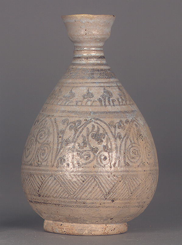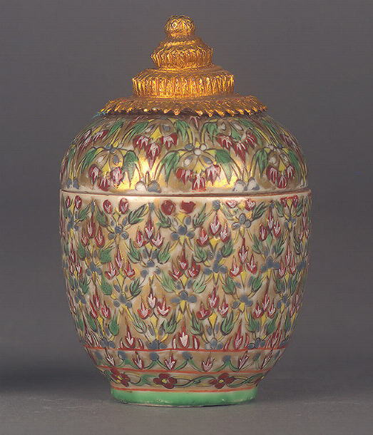 Khmerkeramik. Ein wichtiger Vorläufer siamesischer Keramik ist die der Khmer. Die Khmeroefen lagen z. T. auf heute thailändischem Boden wie in der Nähe von Surin und Srisaket nördlich von Kambodscha. Khmerkeramik vom 10. - 13. Jh. Ist ungewöhnlich geformt: Die Vasen haben hohe, breite Schultern, die sich über die stark verengende Leibung zu schmalem Fuss zusammenziehen. Rustikal sind eiförmige Körper mit engem oder trichterförmigem Hals oder stark bauchige Gefässe mit kleinen Doppelhenkeln. Die hochgebrannte Irdenware hat im 10. Jh. gelblich-weisse oder blassgrünliche, seladonfarbene Glasur, im 10./11. Jh. dunkle Glasur auf hellem Scherben oder umgekehrt, später überwiegend auf dunklem Scherben eine russige, vielfach fleckig dunklelbraune Glasur. Die thailändische Keramik ist längst nicht vollständig erforscht. Der Reiz für das ,Neue', Unentdeckte wird bleiben, denn es sind noch zirka 400 gesunkene Schiffe mit etwa 4 000 Keramiken zu bergen. Ein Teil dieser Schätze wird in einem neuen Museum in Kanchanaburi der Öffentlichkeit zugänglich gemacht.