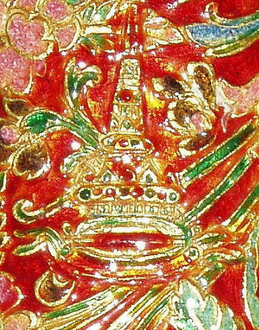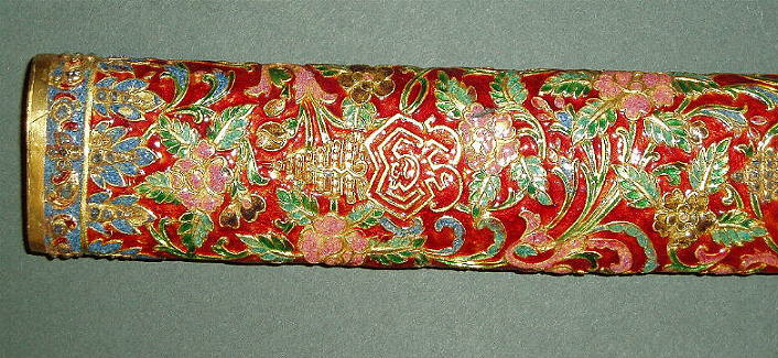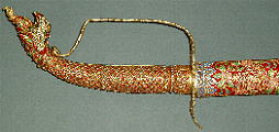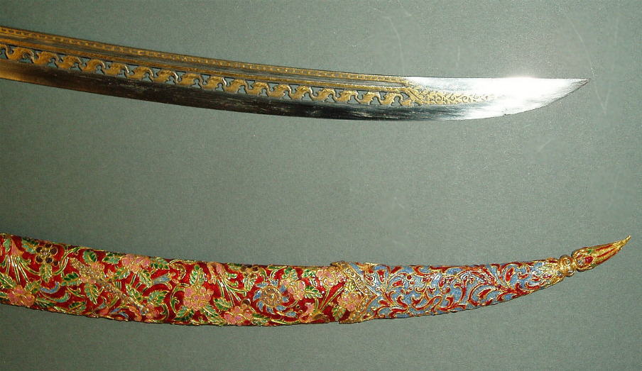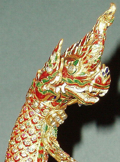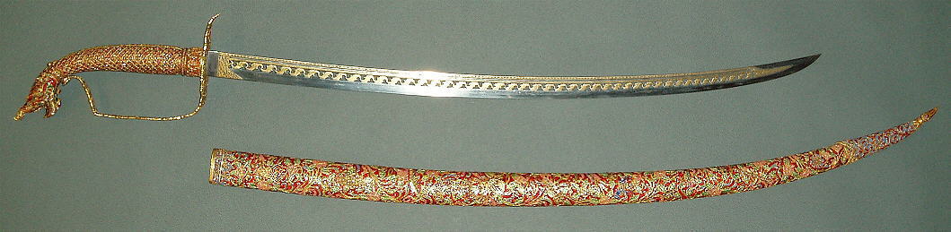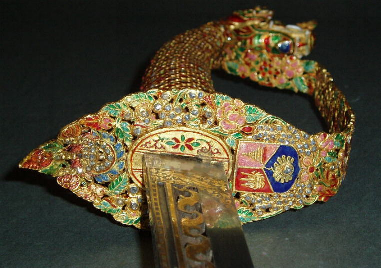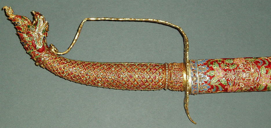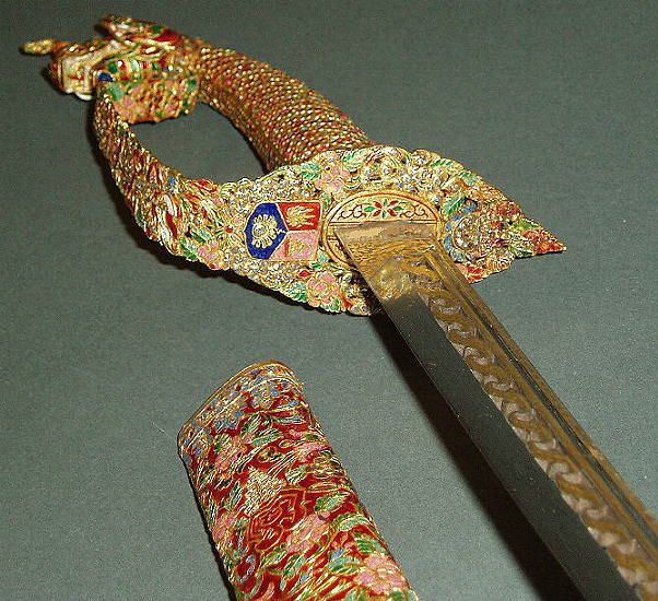 Das Schwert war eines der Geschenke das König Chulalongkorn ( Rama V ) auf seinen Reisen durch mehrere europäische Länder den jeweiligen Herrschern der besuchten Länder überreichte und befindet sich noch heute in Europa. Durchbrochen gearbeitete Eisenklinge mit Gold plattiert; Schwertgriff als dreiköpfiger Nagakönig ausgeführt und (wie die metallüberzogene Holzscheide) mit reichen Gold- und Emailtauschierungen sowie mit Edelsteinen besetzt; in die Schwertscheide und die Schutzplatte am Grund des Griffs sind unter die Blatt- und Blütenornamente mehrere königliche Symbole der Chakri Dynastie eigearbeitet. Länge der Klinge: 63cm, Länge des Griffs: 9.5cm, Länge der Scheide: 75cm, Gesamtlänge (Normalprojektion) 80cm.